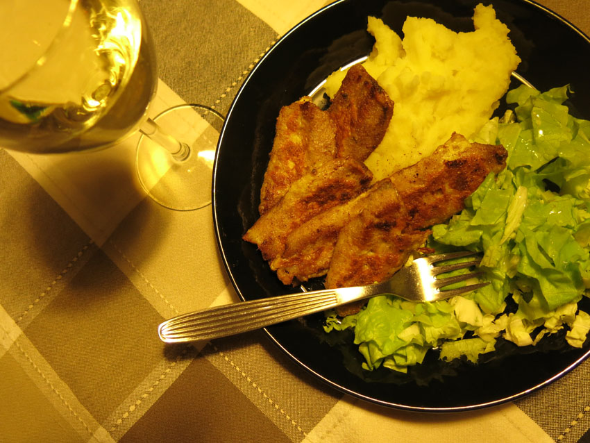 Jag blogga och kom ner och satt på potisen. Monsieur laga strömmingar och dom blev riktigt goda. Jag mosa potisen och satt dit smör och mjölk. Sen blev här sallad. Vi satte oss till bords.